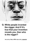 "What I think of you as being is dictated by my own necessities, my own psychology, my own fears, my own desires. I'm not describing you when I talk about you, I'm describing me... I've always known that I'm not a nigger. But if I am not the nigger, and if it's true that your invention reveals you, then who is the nigger?... You still think, I gather, that the nigger is necessary. Well, he's unnecessary to me, but he's necessary to you. So I give you your problem back: you're the nigger, baby, it isn't me." - James Baldwin