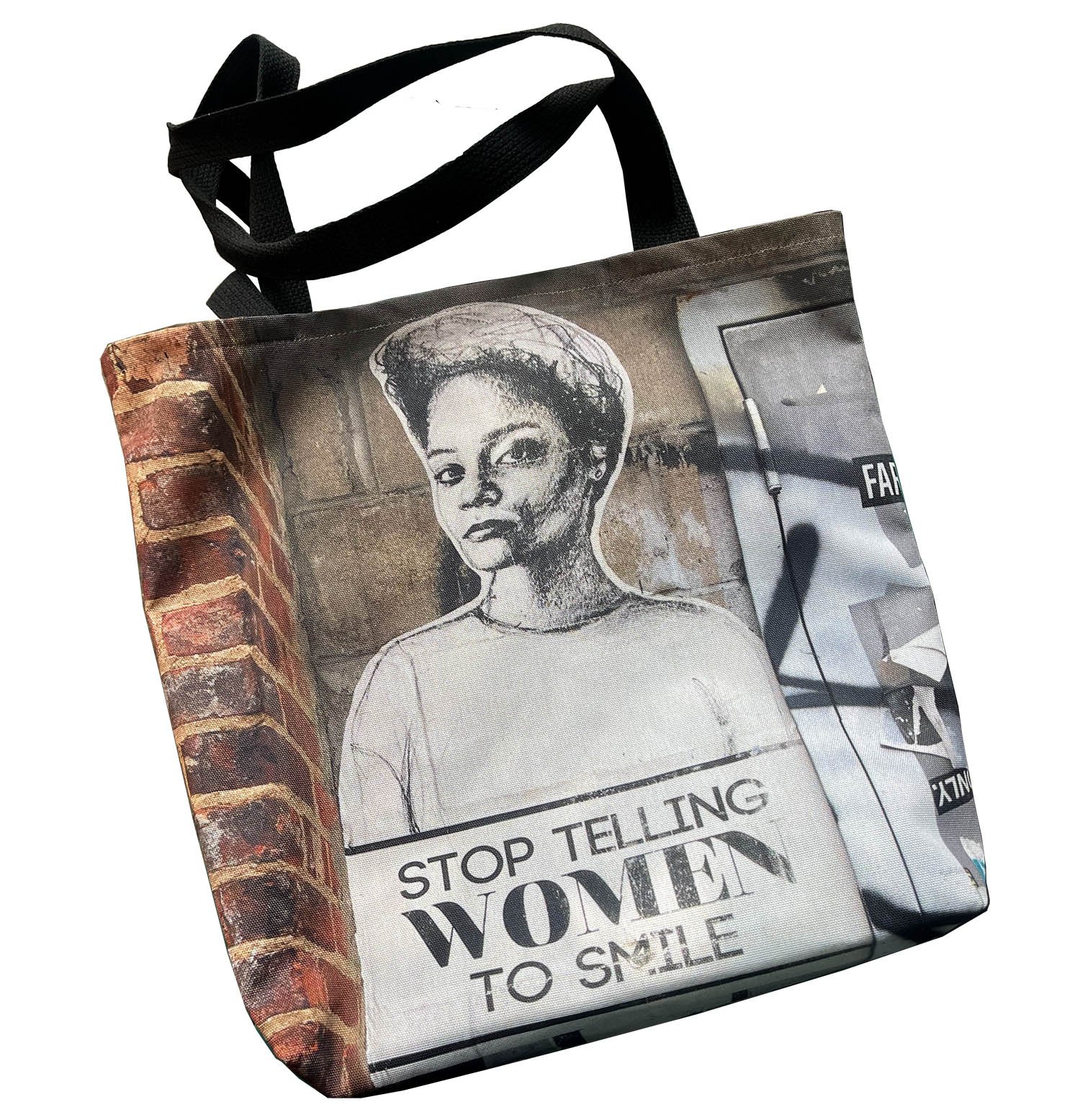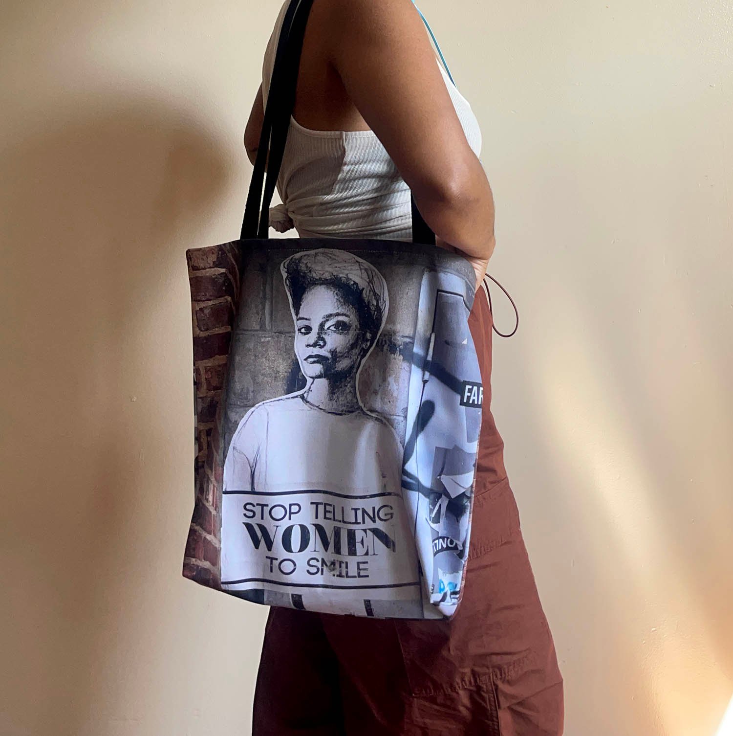 This tote features an all-over photograph of a Stop Telling Women to Smile poster wheat pasted in Brooklyn, NY.